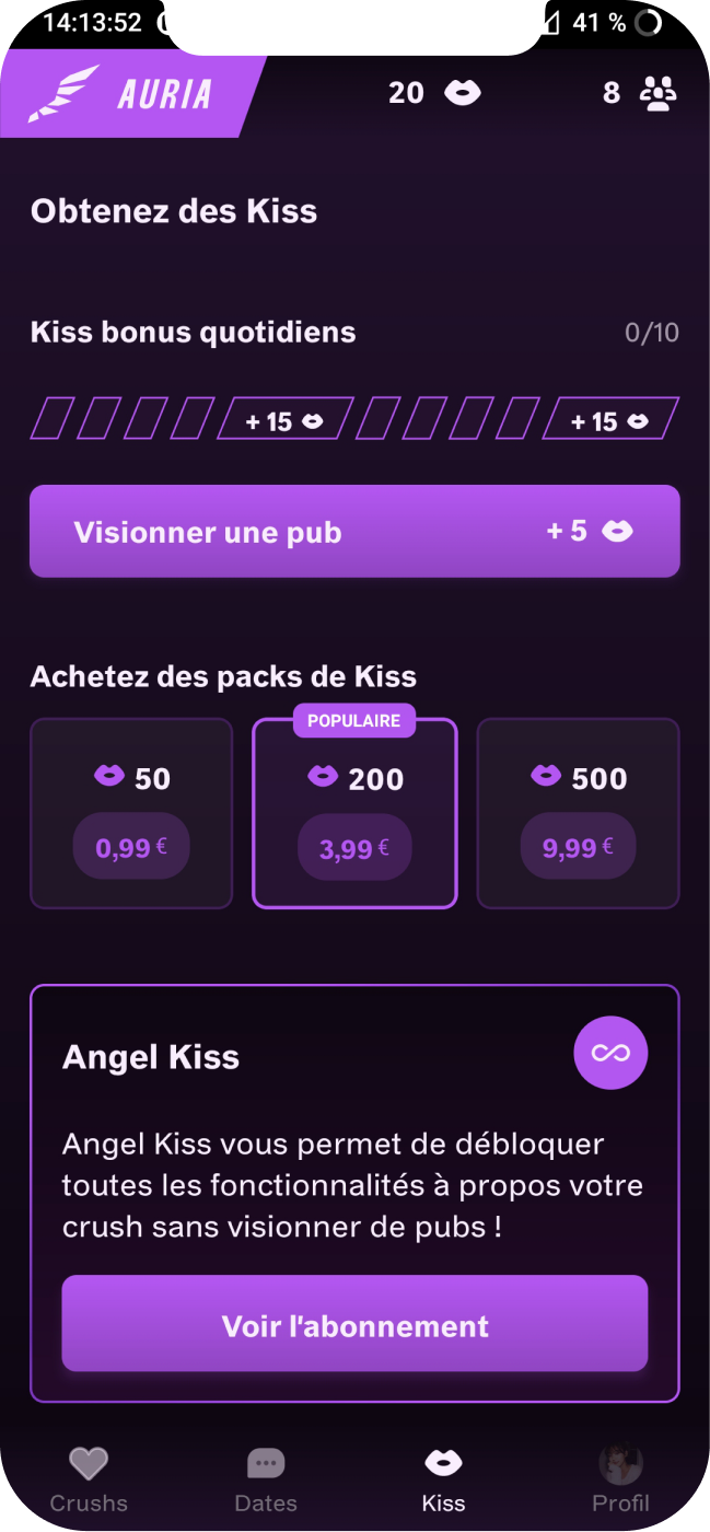 Auria est aussi sans limite ! Utilisez l’application sans le besoin d’utiliser des Kiss grâce à l’abonnement “Angel Kiss”.